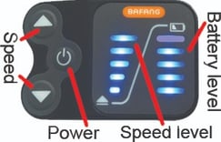 If the screen of the E-bike is off, press and hold the power button. Then you can change between different speeds using the arrow buttons on the bike.